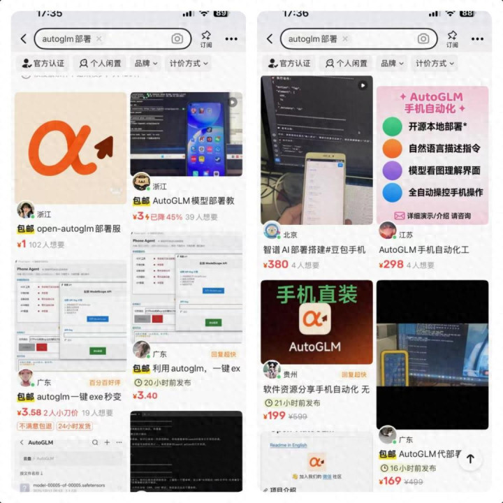 你发现没,智谱的模子刚开源不到一天,闲鱼上就冒出了一大堆 “AutoGLM 部署” 处事,价钱从 1 块钱到 500 块不等,卖家们清一色打着 “无为手机变豆包手机” 的旗子,营业好得不可。