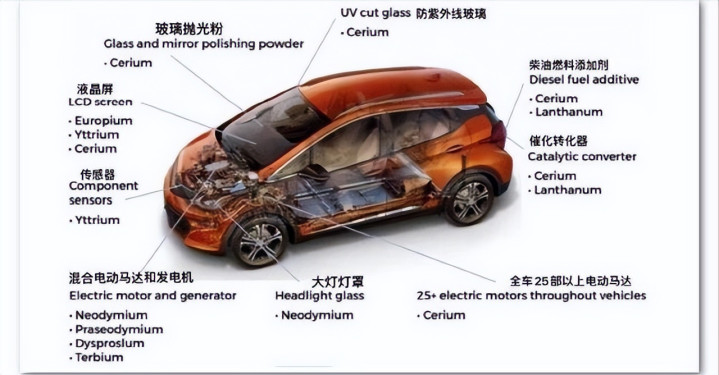 稀土在电动车里重要,每辆需几公斤,用于雨刮器电机和安全带传感器。特斯拉Model 3电机靠钕铁硼磁体,高效运转。